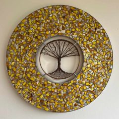 Es schimmert so schön golden/Kupfer/gelb. Ein sinnlicher Anblick. Der Baum ist mit einem dünneren Papierdraht geknüpft, er wirkt sehr filigran und edel. Eingearbeitet habe ich echte Kupferperlen, die wahrlich den ganzen eine Extranote verleihen.
