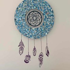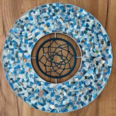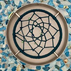 Traumfänger: mit blauen Makrameeband geknüpft, farblich abgestimmte Glasperlen