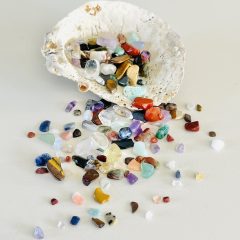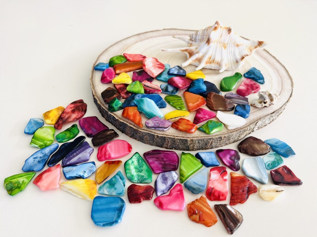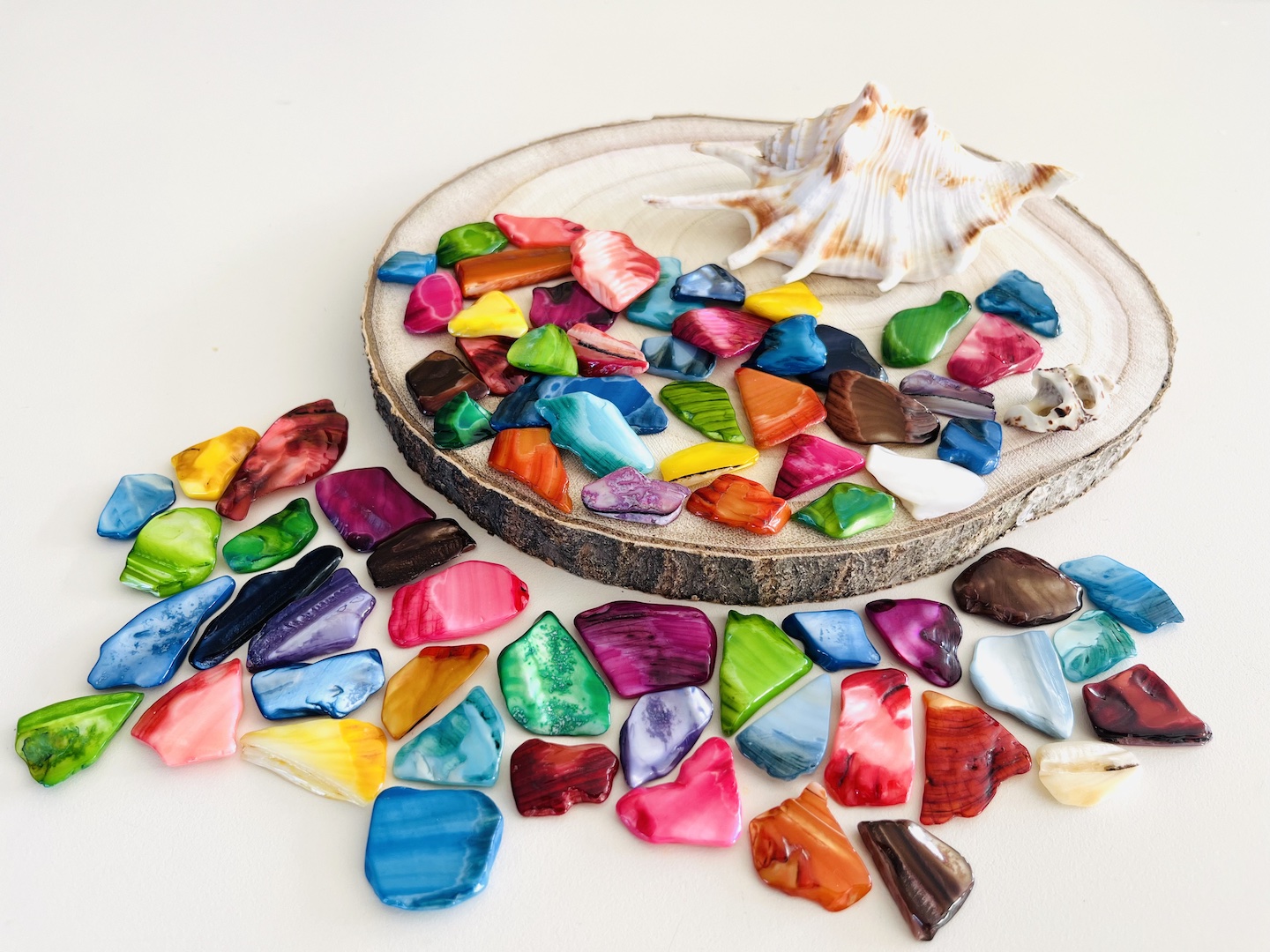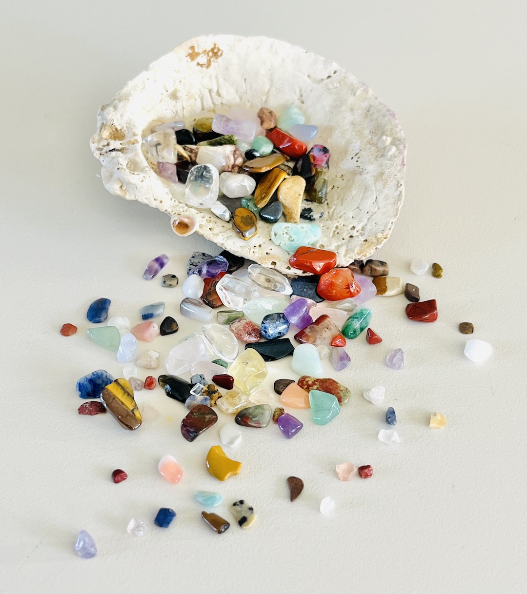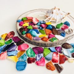 - Auswahl an Perlmutt, Edelsteinen, Glasstrass, Federn, Perlen