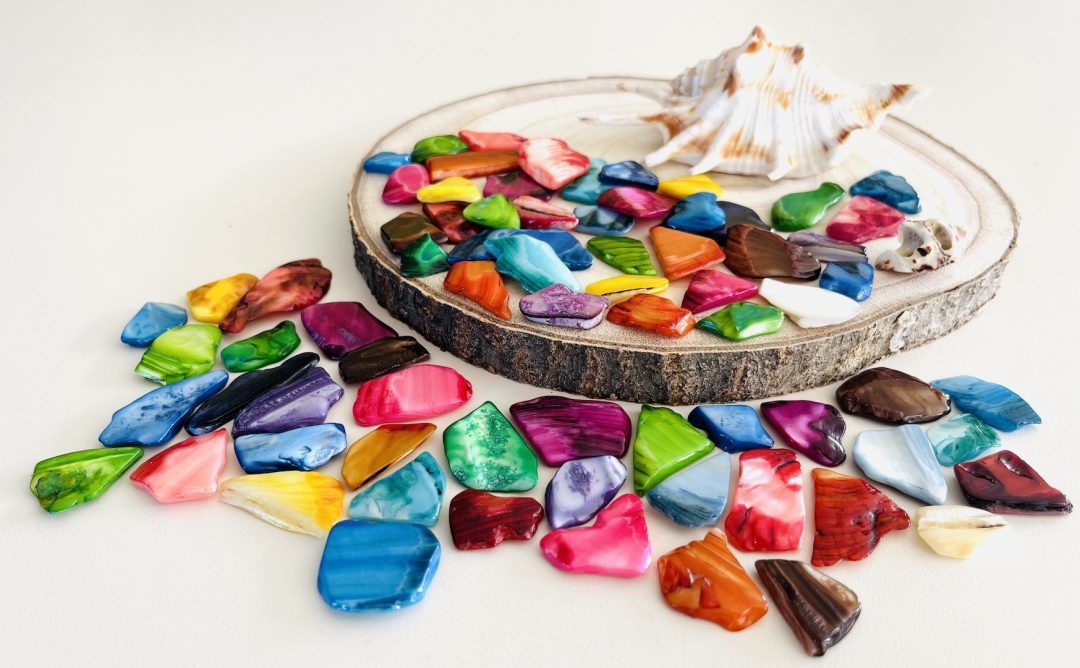 Perlmutt, Muscheln, Edelsteine, Sonnenfänger, Strasssteine, Perlen, Federn und feine Holzakzente,